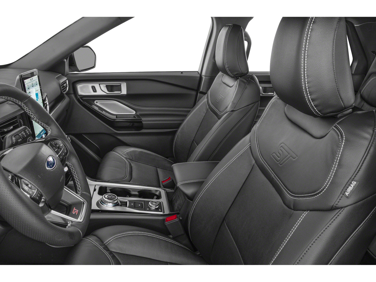 Dressed to impress, the Explorer ST stands out with its aggressive black mesh grille, sleek LED lighting, quad chrome exhaust tips, and striking 20-inch machined aluminum wheels. Inside, the cabin blends sport and sophistication with leather-trimmed seats featuring Miko® inserts, bold ST badging, red accent stitching, and a spacious three-row layout designed for comfort and versatility.