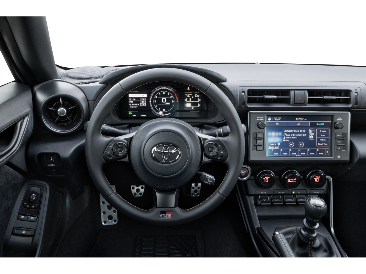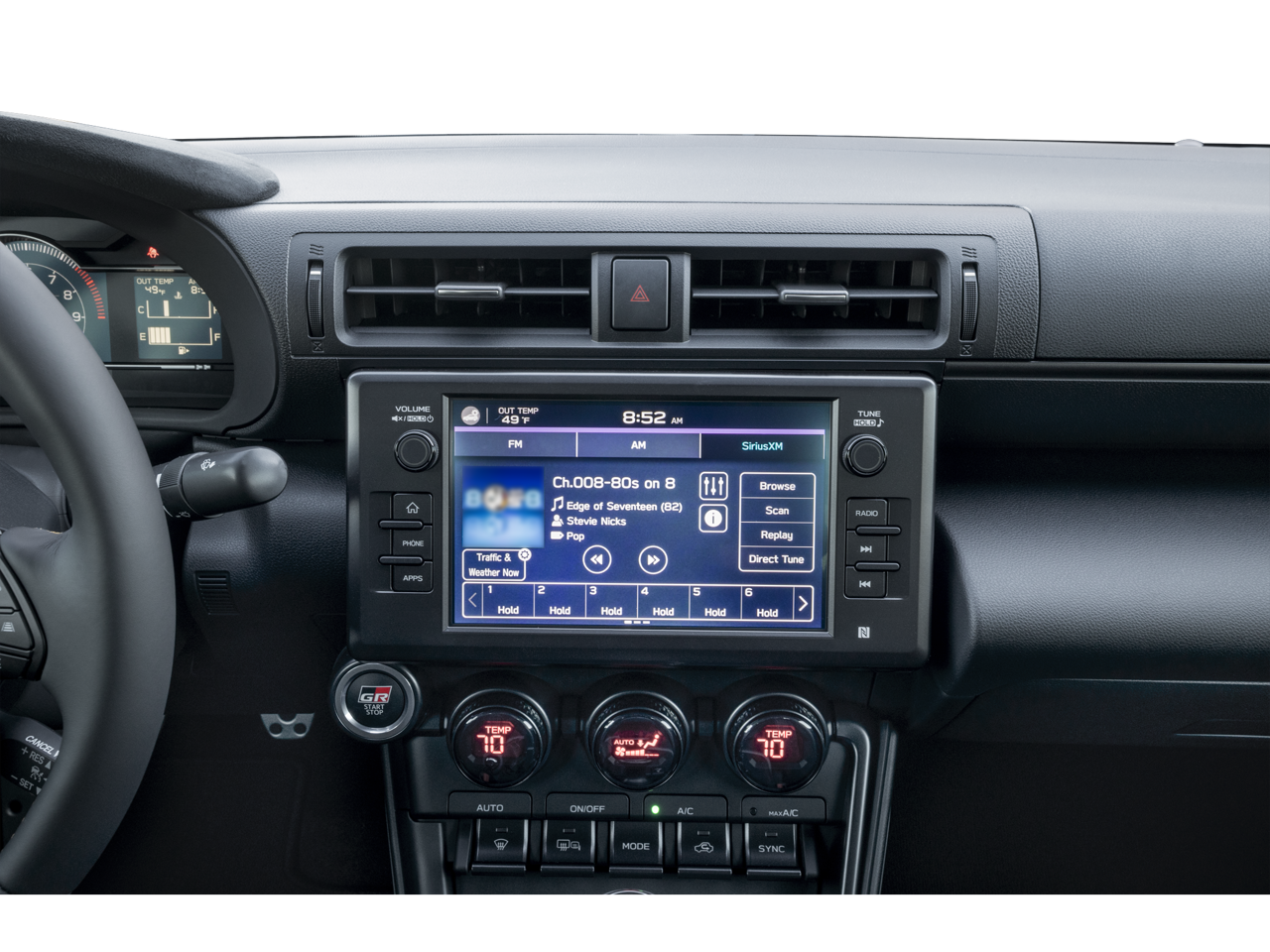 - Radio: GR86 Audio -inc: 8" touchscreen display, 8 speakers including amplifier, Apple CarPlay and Android Auto compatibility, SiriusXM 3-month trial subscription, Service Connect w/1 year trial subscription, Safety Connect w/1 year trial subscription and Remote Connect w/1 year trial subscription